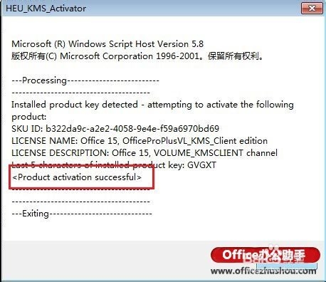 在点击“Microsoft Office 2013 VL”按钮后,等待进度条走完,会有成功或失败的提示,如下图所示。