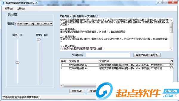 商场和商店的语音提示和语音播放、电子听书、智能辅助阅读无需安装,操作简单,用户只需要将多个txt文稿文件拖入,选择内置的智能语音引擎,即可开始朗读。