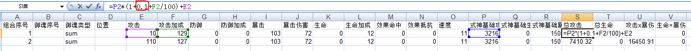 有了汇总数据的表格后,就可以自己做很多扩展了,比如做一个算狗子攻击*爆伤的,只要在式神基础攻击和式神基础暴伤里面把天狗的属性添加进去,就自动计算出攻击*暴伤的值