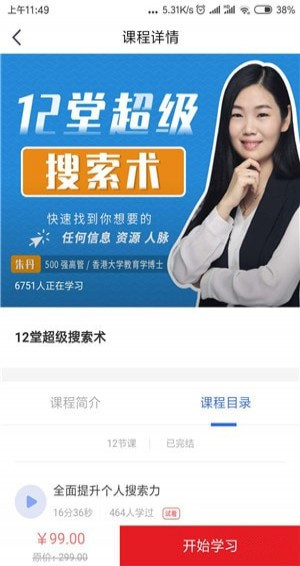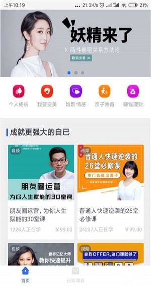 个人技能;软件针对个人成长、婚礼情感、亲子教育、赚钱理财等各类知识推出课程资源,丰富简明的课程资源能够让你在逐渐的学习中不断进步不断成长,不管你是想要学习朋友圈微商赚钱方法还是学习如何提升记忆力,只要你有需要就能找到合适的课程进行学习;软件内课程资源一共分为音频与视频两类,音频的优势在于只要有耳机就能随时随地学习,不需要观看屏幕也不用在乎周围是否吵闹,而视频的优势则是在于画面能够将详细的知识以文字的方法展现,用户能够更好地理解课程内容。