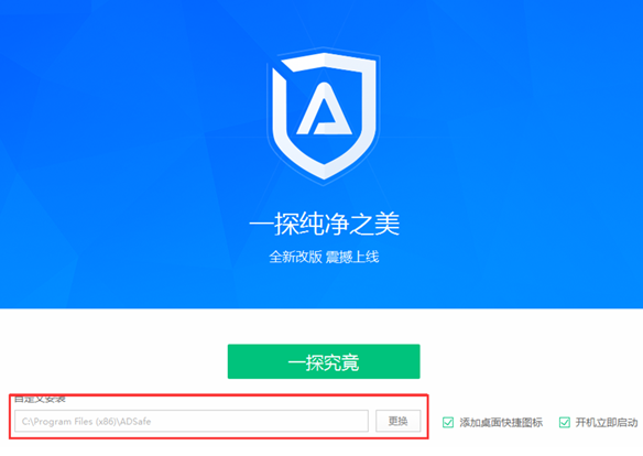 安装步骤1、首先我们需要在本站下载ADSafe净网大师官方软件包,下载完成后我们就可以得到exe的安装文件,我们鼠标左键双击就可以进入到下图中的安装界面,接下来我们开始进行安装。