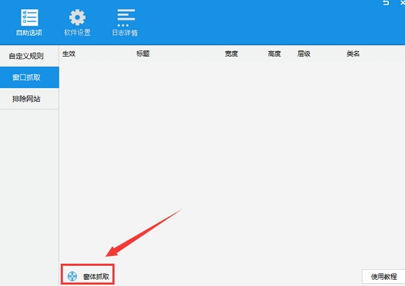 2、接下来我们进入到下图中的界面,我们点击界面下方的“窗体抓取”选项,这里需要注意的是我们左键点击窗体抓取选项后不能松开,要直接拖拽到广告弹窗上。
