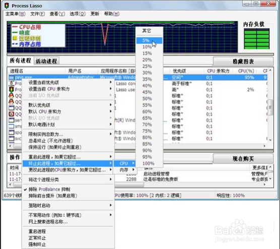 针对电脑中存在的“ping.exe”进程疯狂占用CPU资源的情况,选择使用Process Lasso提供的“终止此进程,如果它超过…”服务,并且自定义将该进程的最大CPU占用量控制在5%,以此约束该进程对系统资源的占用