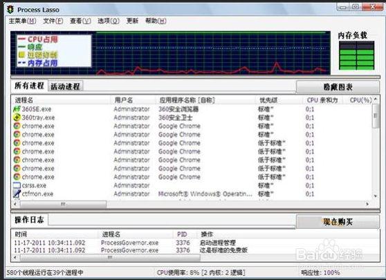 5、Process Lasso在界面运行的过程中,由于有大量信息需要获取并实时显示,可能会看到Process Lasso图形界面或核心引擎进程CPU使用率达到15%~40%,这属于正常现象。隐藏或关闭此界面后Process Lass的资源占用率将会变得非常小,不会拖慢电脑速度。