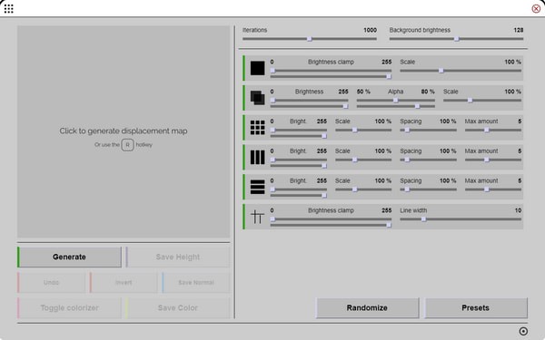JSplacement是一个用HTML和JS编写的跨平台伪随机8K位移地图生成器,可以快速生成各种科幻风格的贴图,生成这种贴图我们就可以用在材质中做置换贴图了,可以生成5类置换图,输出可至8k等!【软件特点】