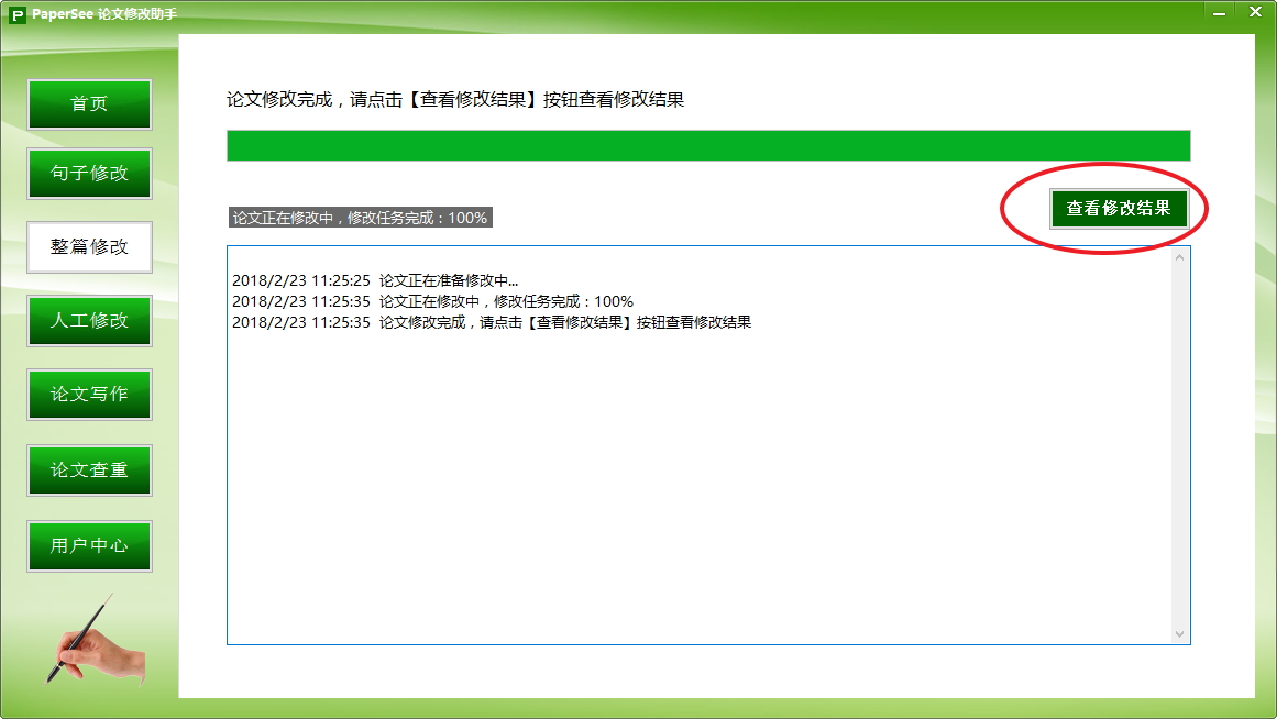 使用论文修改助手就免去了您搜肠刮肚的痛苦,可以迅速把原句改头换面,如果选用整篇修改速度更快,效率更高。