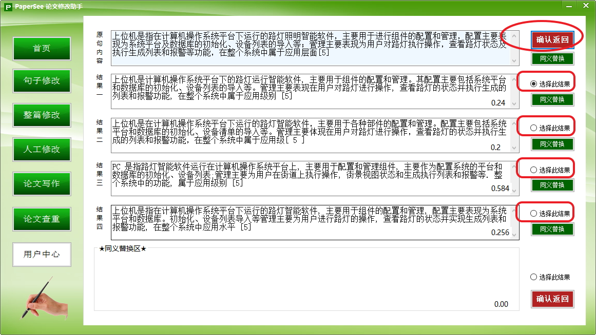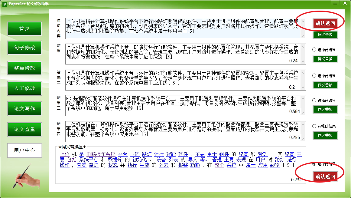 6.句子修改页面:最上面的是论文里面原来的句子,下面是四个修改结果,默认选择的是第一个修改结果,你也可以自行选择一个修改结果,然后点击“确认返回”按钮,返回整篇修改结果页面。