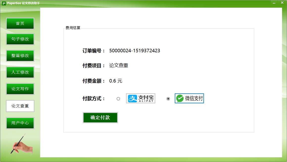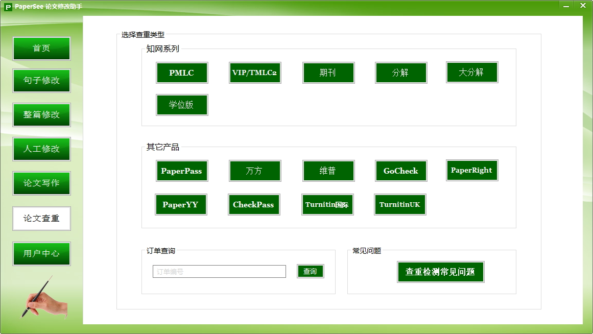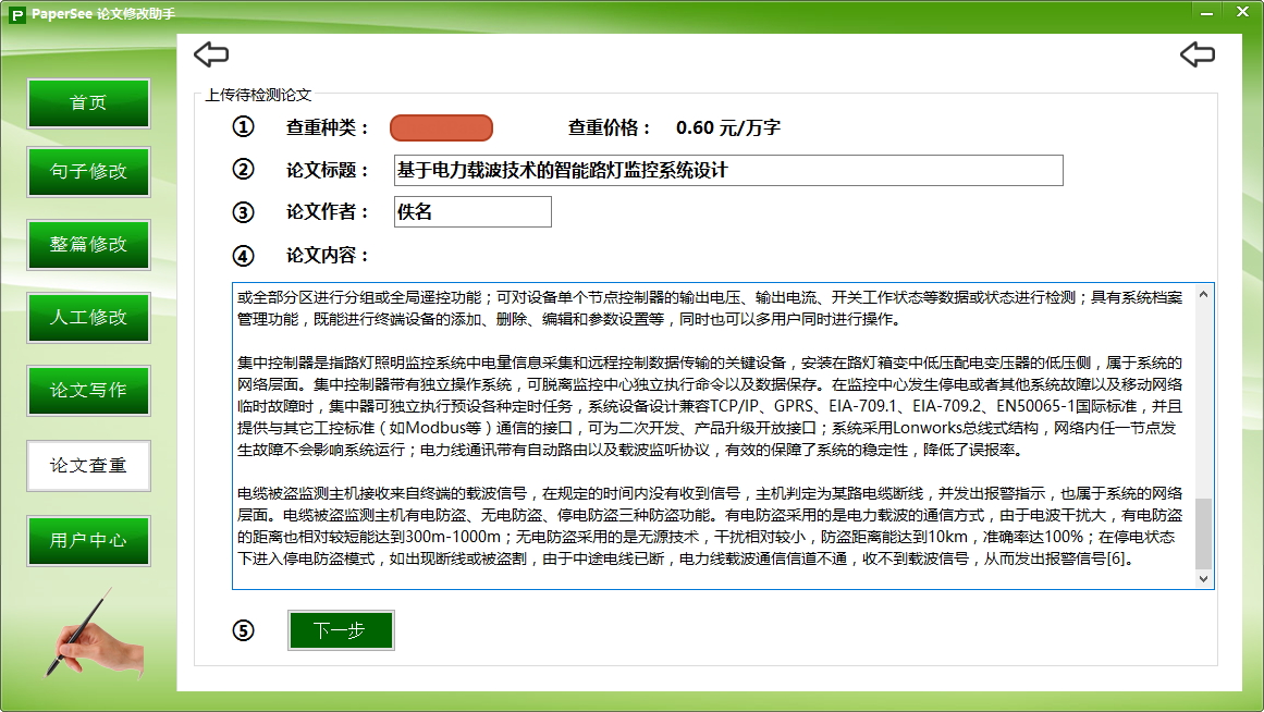 papersee论文降重神器怎么进行论文查重检测1.打开软件,点击软件左侧的“论文查重”按钮。