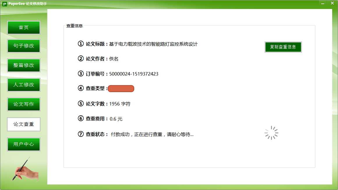 8.付款成功后查重开始进行,耐心等待,一般3-5月份为查重高峰期,速度可能会减慢。