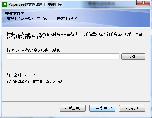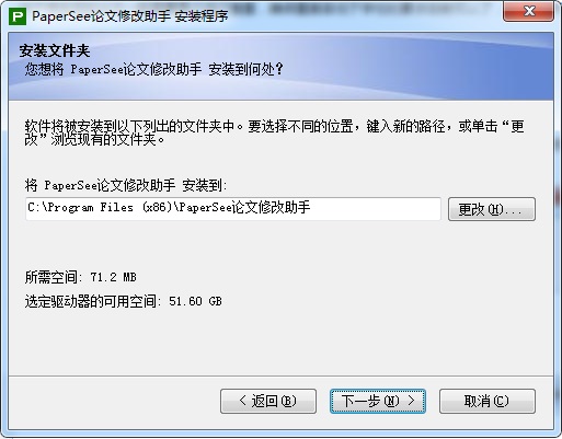 3、选择软件的安装位置,默认位置“C:\Program Files (x86)\PaperSee\论文修改助手”,建议安装在D盘,点击下一步;