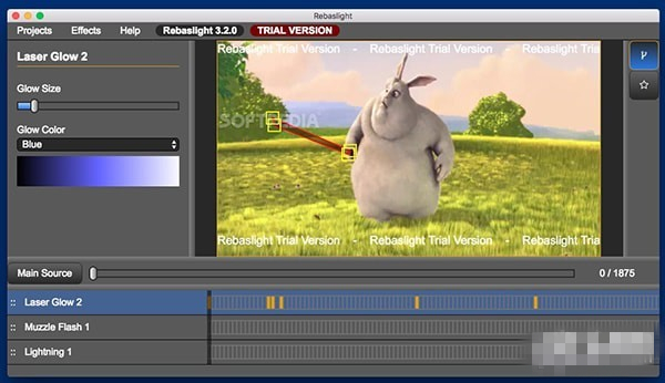 加载电影文件并设置关键帧以简化编辑过程,要在Rebaslight Mac版中加载新视频,您需要使用导入菜单,或者将文件拖放到应用程序主窗口的顶部。注意,您可以通过使用滑块或依赖键盘控件逐帧查看录制。下一步是选择你想要应用的效果(激光辉光,闪电效果),并在旋转镜模式下画出你想要被影响的区域(右键点击删除它们)。值得一提的是,如果您设置了关键帧,Rebaslight Mac版将使各个点之间的移动具有动画效果。
