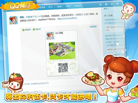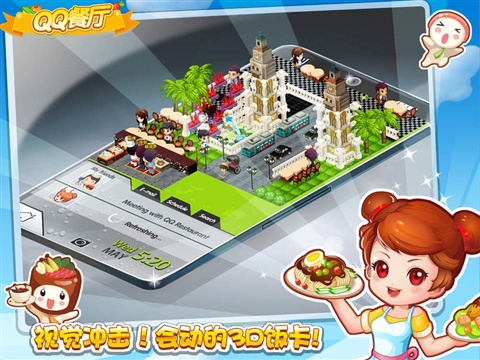 《QQ餐厅HD》是腾讯-qq空间旗下著名的一款以餐厅为背景的模拟经营类游戏。在这里你不仅可以经营属于自己的餐厅,通过对菜肴的研究和对餐厅的个性化打造,成为一代餐饮业大亨。更可以通过ios的移动特性让您能够随时随地在任何地方体验到与pc版本相同的餐厅乐趣。