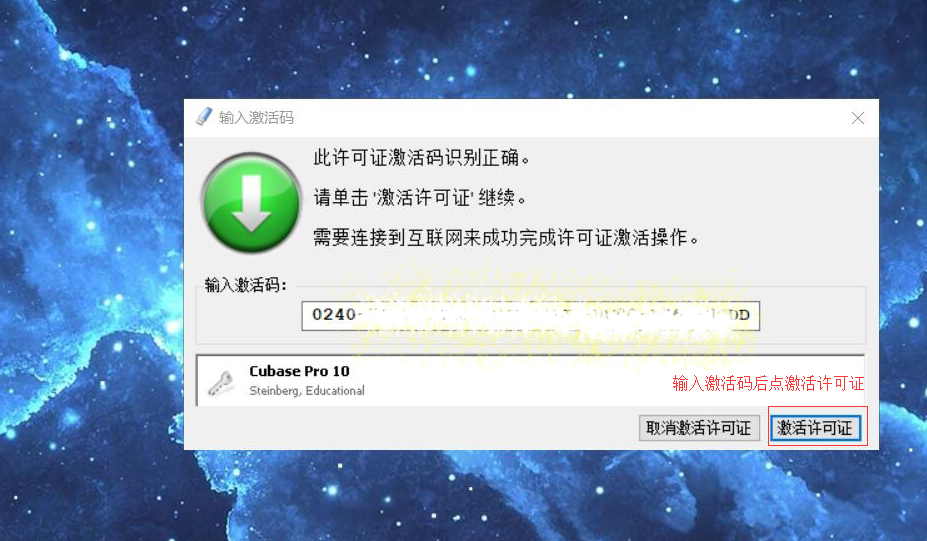 3、输入刚刚所获得的“Activation Code for Cubase Pro 10”,输入完之后,点击“激活许可证”,(O和0,里面带一条斜线的是“零”,没有斜线的是“欧”)。如果出现网络连接错误的情况,可以用您的手机给电脑发射一个无线热点,或使用 VPN激活软件。