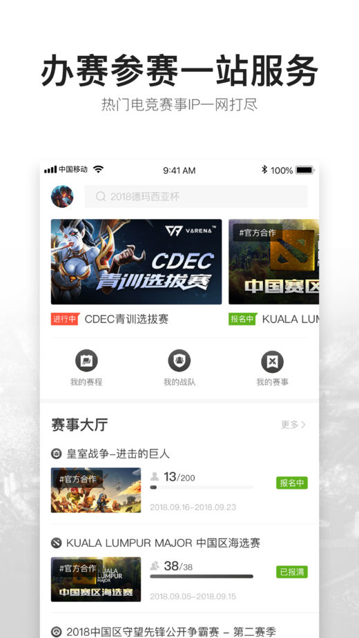 【游戏赛事举办】支持皇室战争,DOTA2,LOL,PUBG,OW,CR等多种热门电竞游戏IP,从创建赛事到数据分析,您的任何需求,我们帮您解决【官方游戏赛事】拥有暴雪,腾讯,supercell知名厂商的海量赛事资源,通过数据分析游戏行为助你提高竞技水平,下一个职业选手,说不定就是你