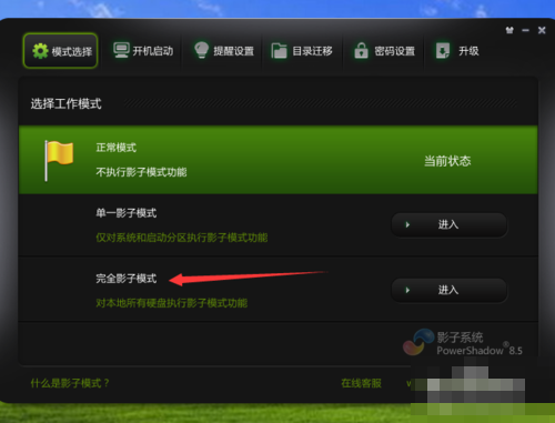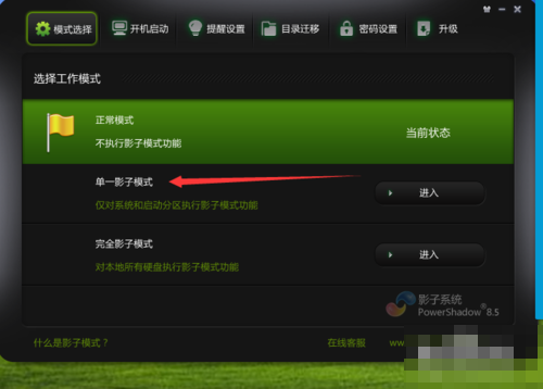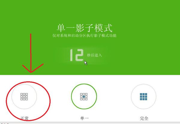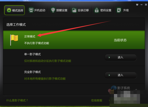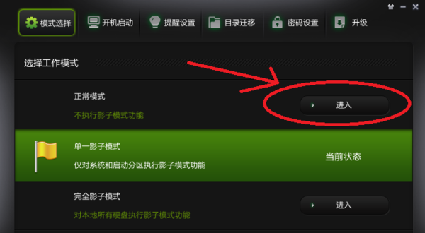 3、或者,打开影子系统软件界面,点击模式选择,然后点击正常模式右侧的"进入"按钮。