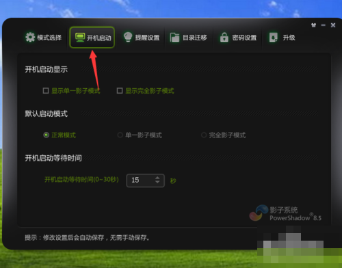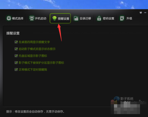 5、点击箭头所指的地方是提醒设置,这是为了防止大家在电脑进入完全影子模式又或者单一影子模式的时候下载文件或进行其他操作,如果在这两种模式下操作,电脑一但重启,数据便会消失。
