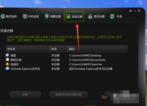 6、点击箭头所指的地方是目录迁移,在电脑进入单一影子模式的时候,目录迁移可以把电脑里的一些软件的默认保存在C盘的文件转移到其他盘,这样的话,就算重启,仍然会保存数据。