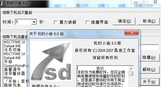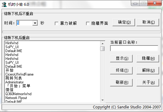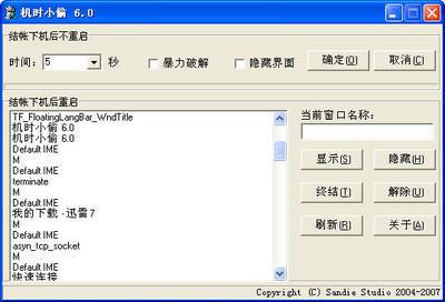 2.找一台机子把你刚充的账号上的余额用得快不足时(注意留一点用来打开和设置机时小偷)打开机时小偷,在‘窗口名称’列表框内找到网管软件的主要进程窗口的名字,点击“终结”就可以了。