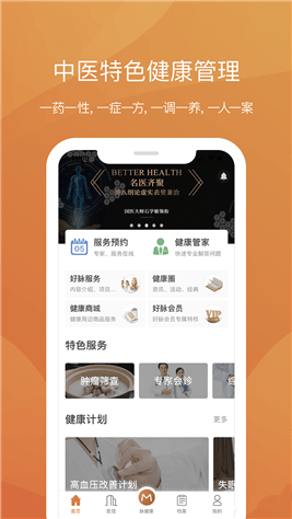 好脉健康结合现代中医健康理念,提供全方位健康管理服务,通过一对一健康管家和私人医生为您量身定制健康管理计划,提供专业健康改善解决方案。配合高端医疗设备检测治疗,智能可穿戴设备身体数据实时监测,名医名药、高端理疗、药膳在线预约等实现一站式健康管理服务。