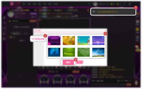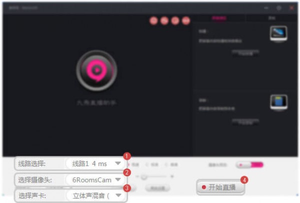 3、在软件窗口正确设置:①线路选择②摄像头③声卡。点击④”开始直播“按钮进入直播间开始直播。