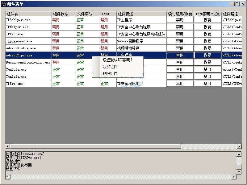 手动模式(高♂级):手动禁用、恢复组件,可添加自定义禁用组件清单、可删除组件清单