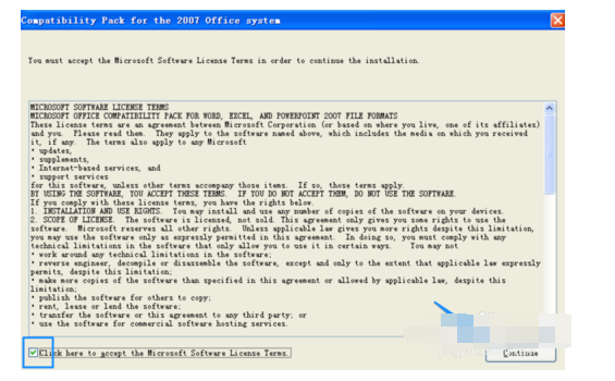1、下载完成以后,打开安装包,勾选软件使用条款并点击 Continue 按钮;2、安装完成以后,就可以正常打开 office2007 的文档了,如docx,xlsx等文件类型。