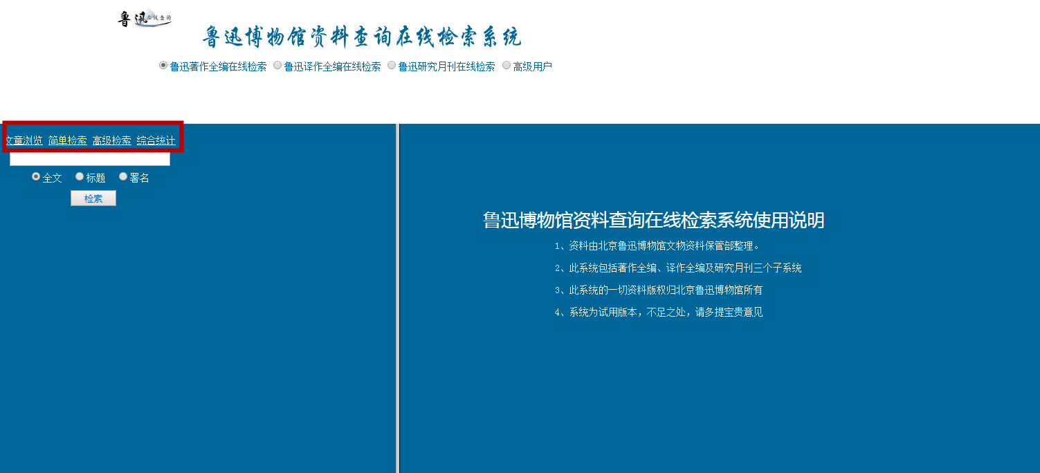 1、资料由北京鲁迅博物馆文物资料保管部整理。2、此系统包括著作全编、译作全编及研究月刊三个子系统