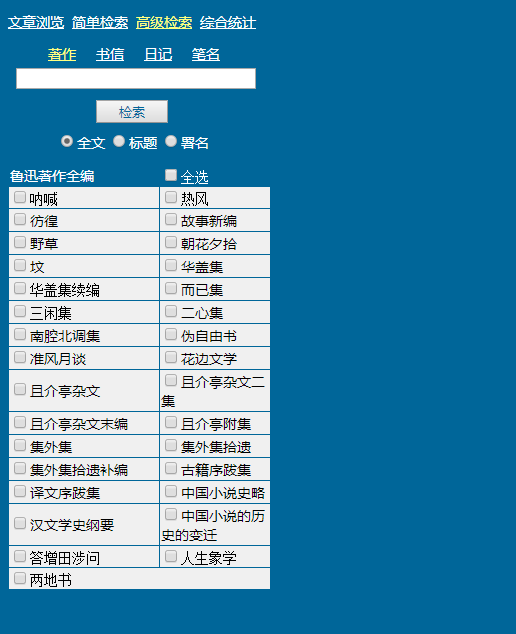 5、如果用户使用高级检索功能的话,就可以在鲁迅先生的所有著作、书信、日记和笔名中进行查找。同样也包含了搜索全文、标题和署名三种方式。