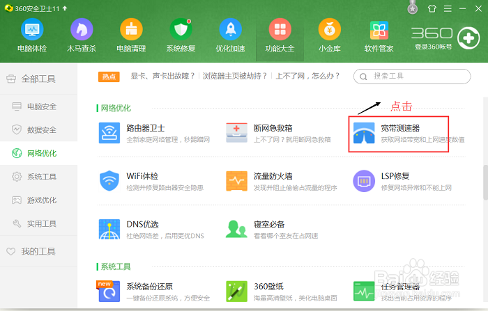 接着找到工具“宽带测速器”,然后点击这个工具,如下图所示位置。