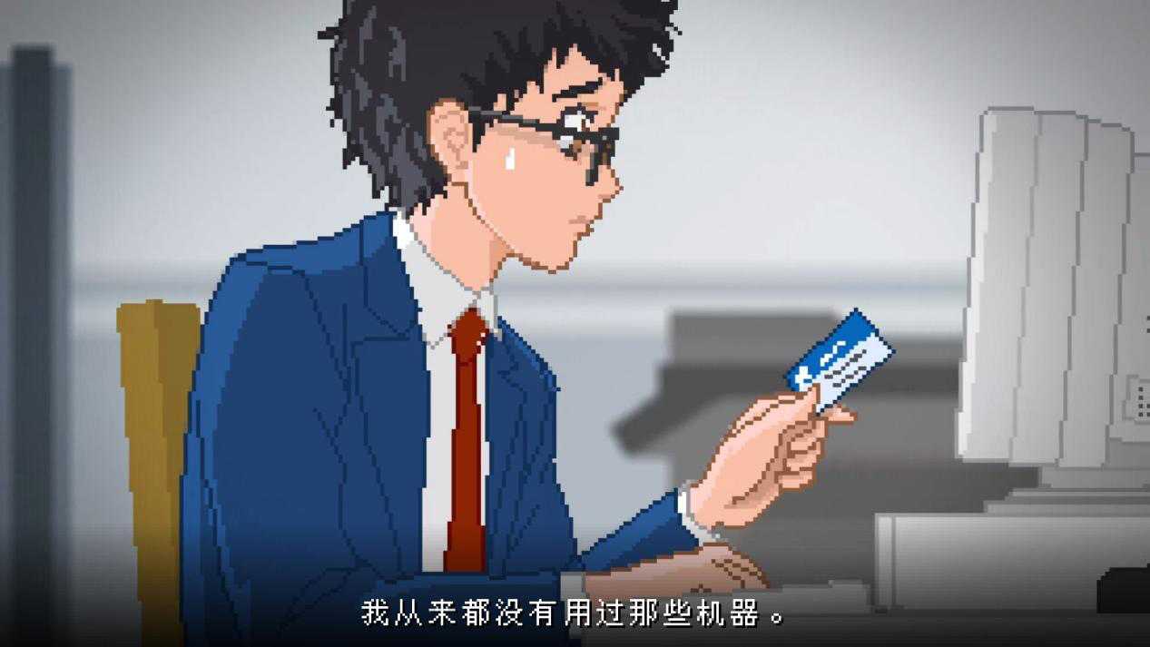 实景拍摄、日系动画、16bit像素风在精心设计的剧本内依靠主线推进相互穿插,在剧情逻辑上自洽又突兀,剧情氛围上奇妙的平衡让玩家很容易模糊了现实与虚拟的界限,将自己带入其中。而主角作为乌托邦制度下的“社畜”,其见闻也足以让正在工作的大龄玩家们产生一些有模有样的思考与共鸣。