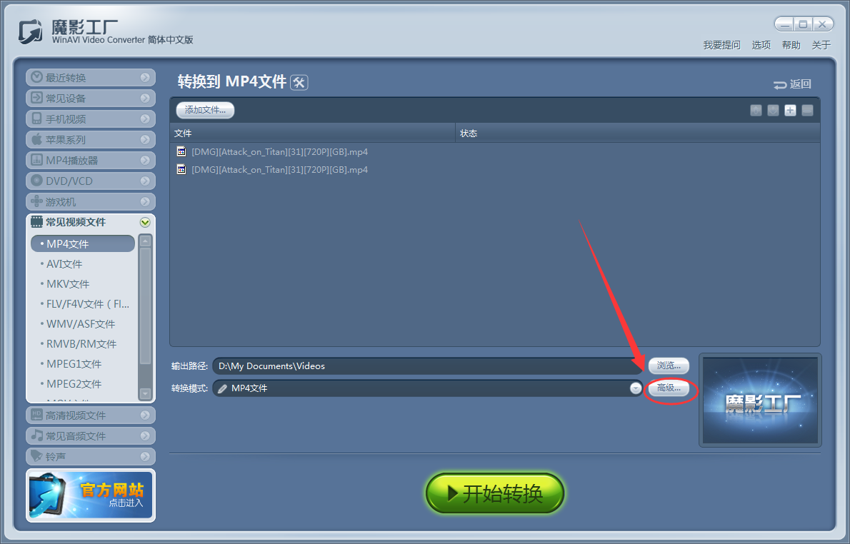 4、添加完毕后在“转换格式”的右边点击“高级”按钮,如下图所示: