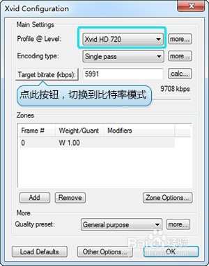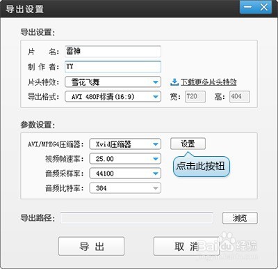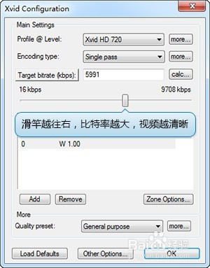 下面以720P分辨率为例,点击“导出视频”按钮,在弹出的导出设置中点击“设置”按钮,然后会弹出一个对话框,首先在“Profile@Level”选项中,选择“Xvid HD 720”,然后点击滑竿上方的按钮切换到比特率模式,拉动滑竿,滑竿越往右,比特率越大,视频越清晰。
