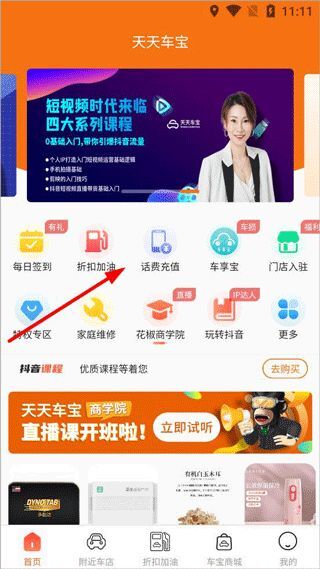 1. 开启天天车宝,界面设有首页、附近车店、折扣加油、车宝商城以及我的板块。其中,首页具备基础功能。