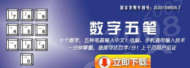 数字五笔中文输入系统2013十个数字,五种笔画输中文,三分钟掌握,单手输入,速度可达百字/分! 完全摒弃传统的汉字拆分、字根理念!笔顺输入,上手就会,不背字根、不拆汉字。创新专利技术,完美解决笔画输入慢,不能支持词组输入的问题。