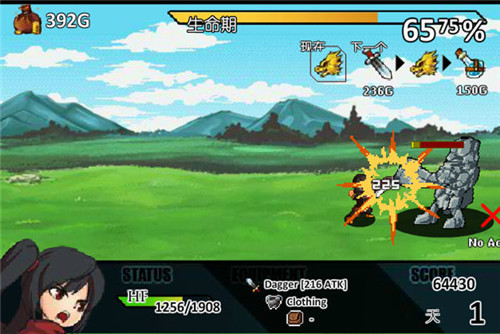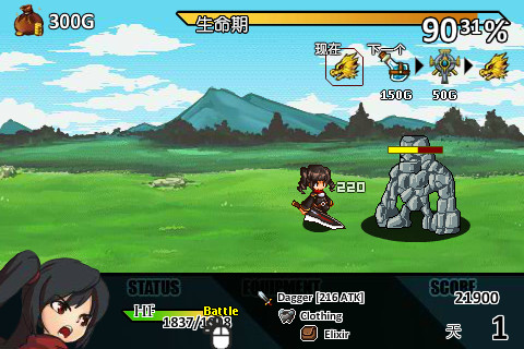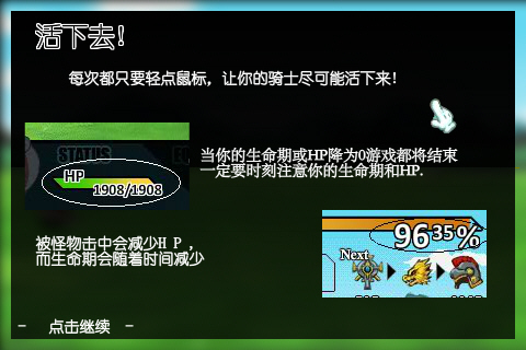游戏开始后玩家就会开始奔跑,所有动作都是靠鼠标来完成。在画面的右上方有四个框框,这代表接下来会遇到的事件,每种事件有不同的作用:金狼头:战斗,可以打倒敌人获得金钱