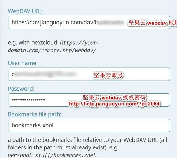 4、坚果云 + Floccus:以坚果云的 WebDav 为例简单介绍第一种同步方法, 新建 XBEL in WebDAVA 账户,接下来就一张图。