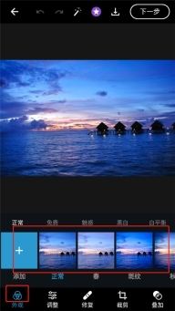 5、轻点左下角首个图标,也就是滤镜图标,此时既能选择系统预设的滤镜效果,也能够自行组合搭配。