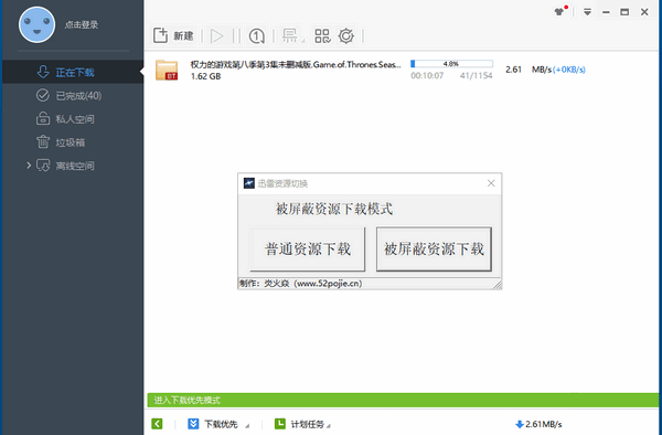 迅雷阻止敏感资源下载的方法应该是将下载信息发送到那三个服务器(还有没有其它服务器不清楚)进行鉴别,如果不列为敏感资源或无法链接服务器则直接下载,这样我们只需要直接屏蔽服务器就好了。为什么还需要普通下载模式,因为像emule、有些bt之类的,用迅雷下载的时候它会帮你提权插队,屏蔽那些服务器之后就需要自己慢慢排队,有时候甚至一直排不上完全下载不到。所以,不是被屏蔽的资源,还是仍然用普通下载模式比较快的。
