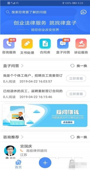律盒子app是一款为广大企业和个人解决法律问题的应用软件,提供丰富专业的法律知识和问答,同时入驻了更多专业的律师资源,为你提供一站式的法务服务。你可以通过软件在线与律师进行一对一专属的咨询,所有法律相关的问题都能轻松解决,还能直接的在线下载合作合同,通过上传提交的方式展示给律师,任何的法律问题和合同问题都能了如指掌,帮助企业提供优质的法务意识,你还可以进入盒子问答板块,里面拥有大量常见的法律问答内容,通过你问我答的形式帮助你能够更加直观透彻的知晓情况,告别专业回答不懂、不明白的短板。