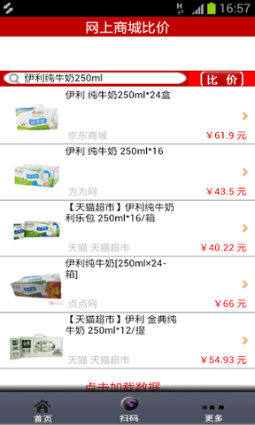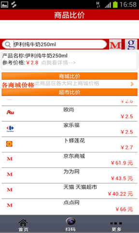 4、 支持手机扫条形码,自动搜索淘宝的各个商家的价格,实现价格比较;