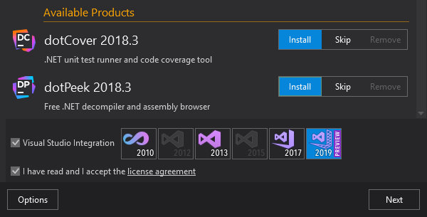 从版本2018.3开始,ReSharper开始支持Visual Studio 2019,并且可以集成到Visual Studio 2019 Preview 1版本中。 Visual Studio 2019正式发布后,ReSharper将在未来更新中提供全面支持。
