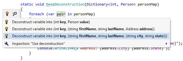 除了增强的解构支持和使用最新的VB.NET版本之外,针对不同情况的C#和VB.NET代码分析还添加了许多新的检查,快速修复和上下文操作,包括: