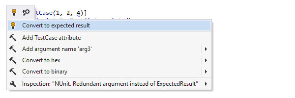 此更新引入了一组代码检查,其中包含相应的快速修复和上下文操作,可以帮助您更快地编写NUnit测试。