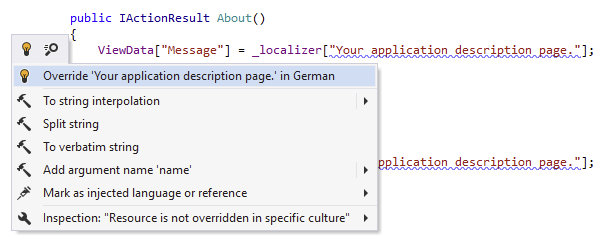 ReSharper支持最新ASP.NET Core中引入的新本地化过程,以帮助您以现代方式本地化您的顶级Web应用程序。 您可以在Controller,View和资源文件中使用ReSharper的帮助。 现在,它包括: