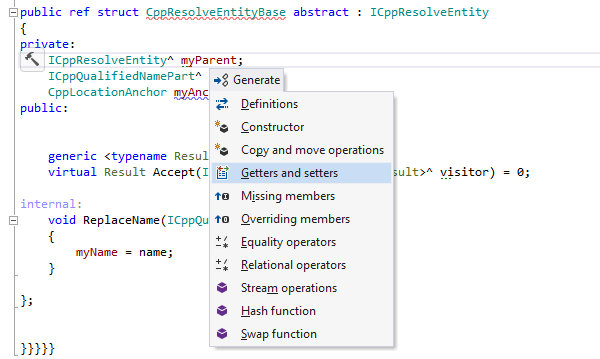 两种类型的项目将特别受益于此版本。 第一种类型是C ++ / CLI(需要ReSharper Ultimate),它获取新的Generate动作以生成相等运算符,哈希函数,getter和setter,构造函数,以及创建派生类,结构或接口的能力。