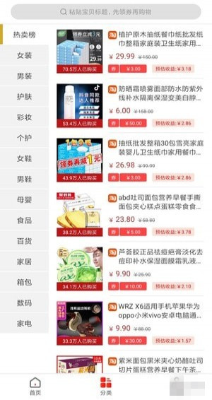 9.9包邮、高佣商品、24小时热卖榜、母婴用品等专属特色栏目。