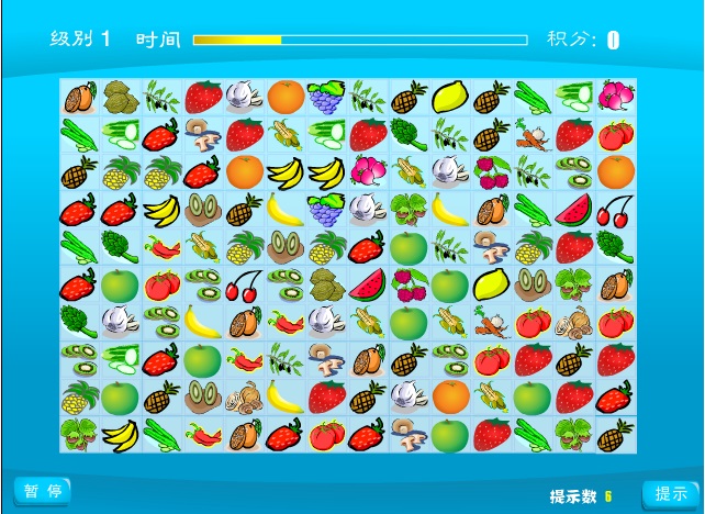 当消除一定的数量后,最好让图案形成中间有一条横的通道,这样找到同样的蔬果机会就会更大一些,相对过关也就容易一些。注意屏幕下方右角有“提示”,当你实在找不到目标了,就按“提示”,可以帮助到你的。
