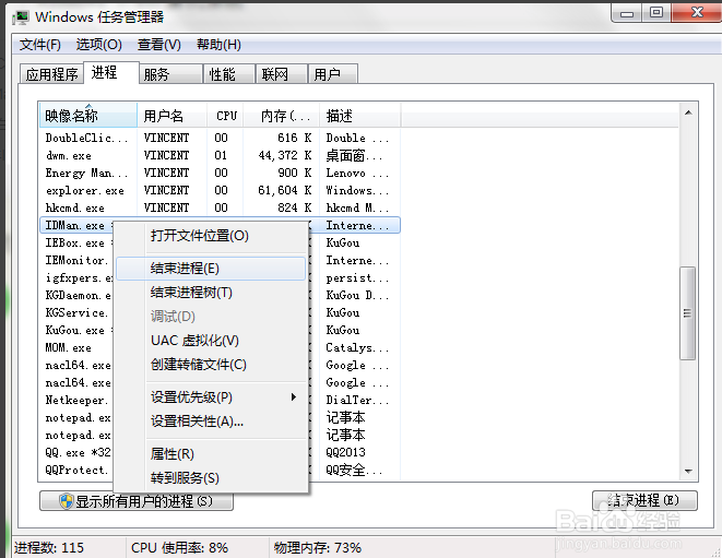 1、按Ctrl+Alt+Delete打开任务管理器,打开任务管理器后,找到IMD所有的进程,点击鼠标右键在弹出的选项中点击【结束进程】。