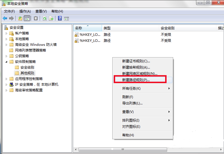 4、打开本地安全策略窗口,点击左侧的【软件现在策略】,然后找到【其他规则】选项,在右侧界面中,点击鼠标右键,在弹出的选项中点击【新建路径规则】。
