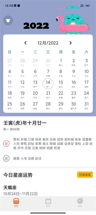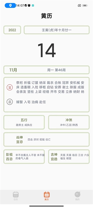 4、大家能够看到,黄历页面内容十分详细,各项宜忌事项的选择都有详尽说明。